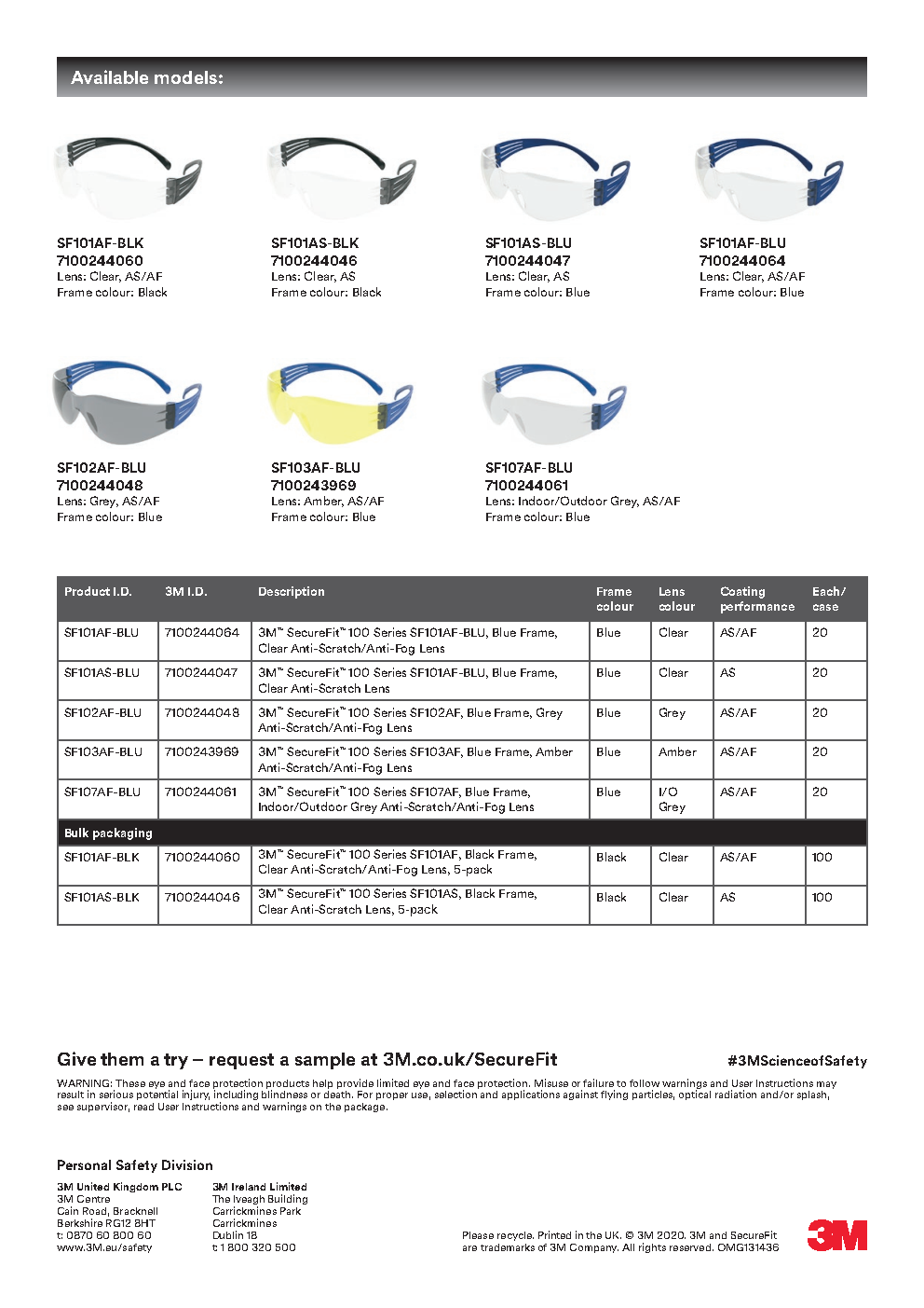 3M™ SecureFit™ 100 Safety Glasses (SF101AF-BLU-EU); Lightweight safety glasses with self-adjusting Pressure Diffusion Technology and premium Anti-Fog/Anti-Scratch Clear lenses for all-day comfort and vision.